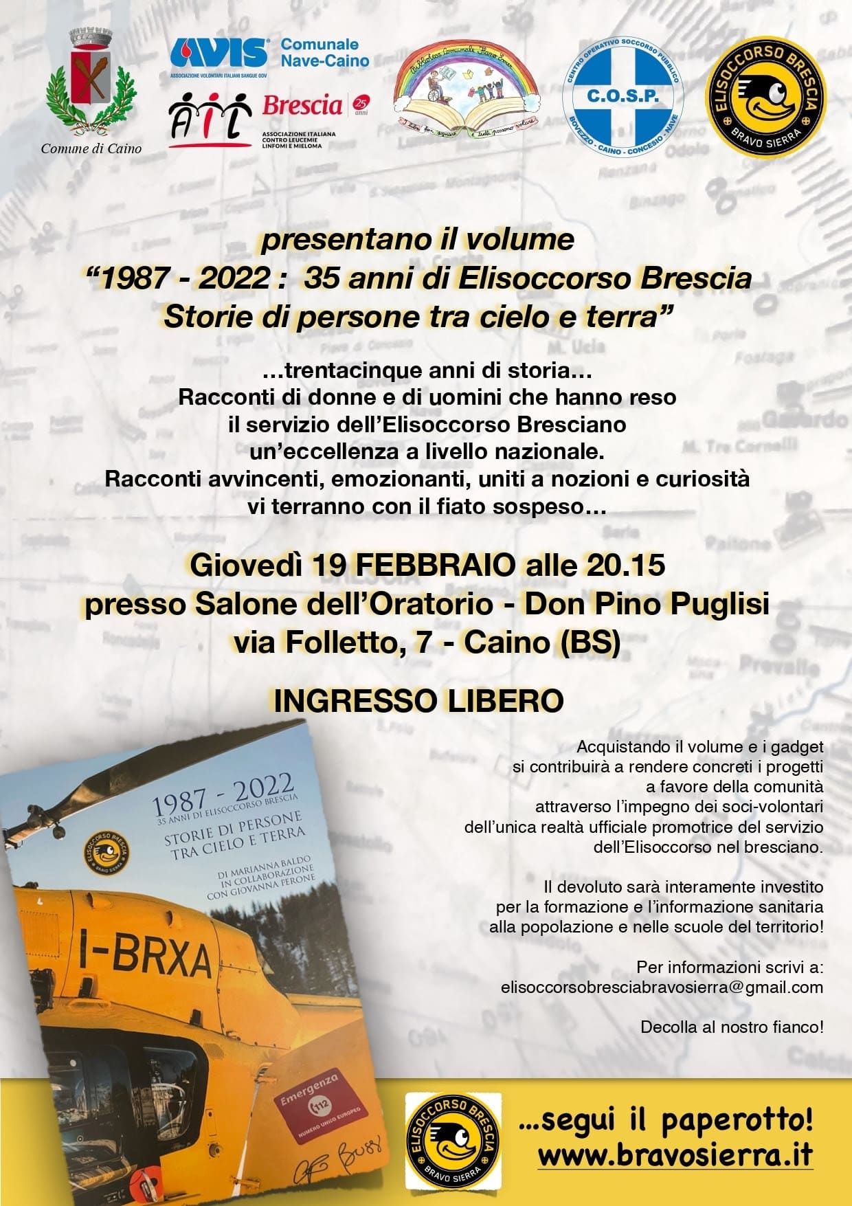 Il Comune di Caino, in collaborazione con AVIS, AIL e C.O.S.P., ospiterà l’incontro per la presentazione del volume: “1987 – 2022: 35 anni di Elisoccorso Brescia – Storie di persone tra cielo e terra”. Un libro che non è solo una cronaca tecnica, ma un viaggio emozionante attraverso i racconti degli uomini e delle donne che hanno prestato per anni servizio.