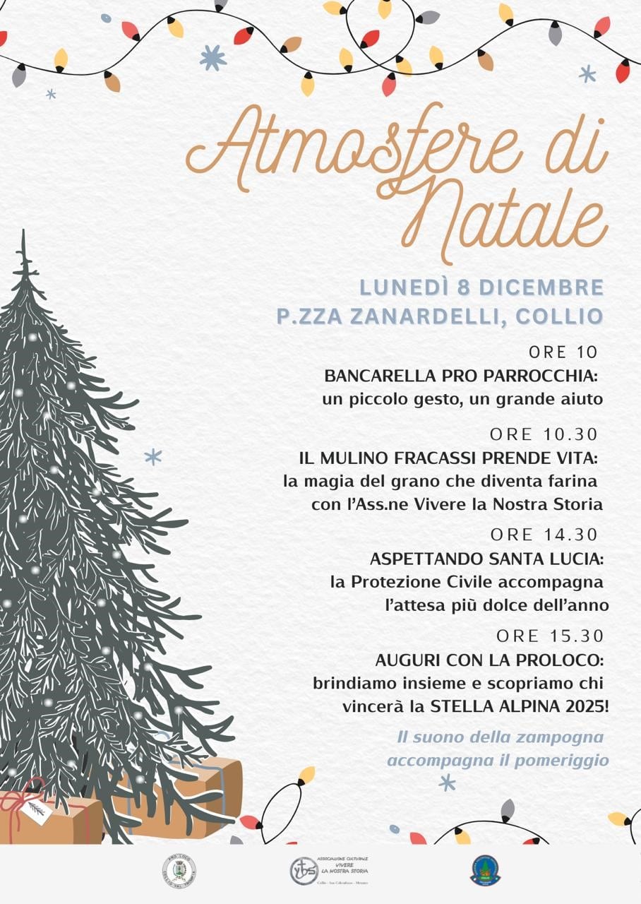 Scopri il vero spirito del Natale a Collio con un’intera giornata dedicata alle tradizioni e alla festa. Lunedì 8 Dicembre, ti aspettiamo in Piazza Zanardelli per “Atmosfere di Natale”, un evento imperdibile che scalderà il cuore in attesa delle festività.