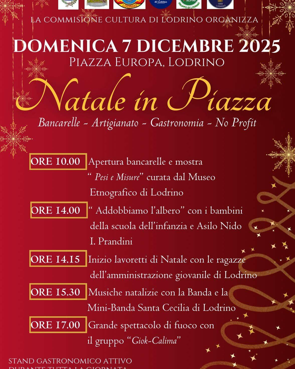 La Commissione Cultura di Lodrino vi invita a trascorrere una giornata magica in Piazza Europa con l’evento “Natale in Piazza”, un appuntamento imperdibile per immergersi nello spirito natalizio in Valle Trompia!