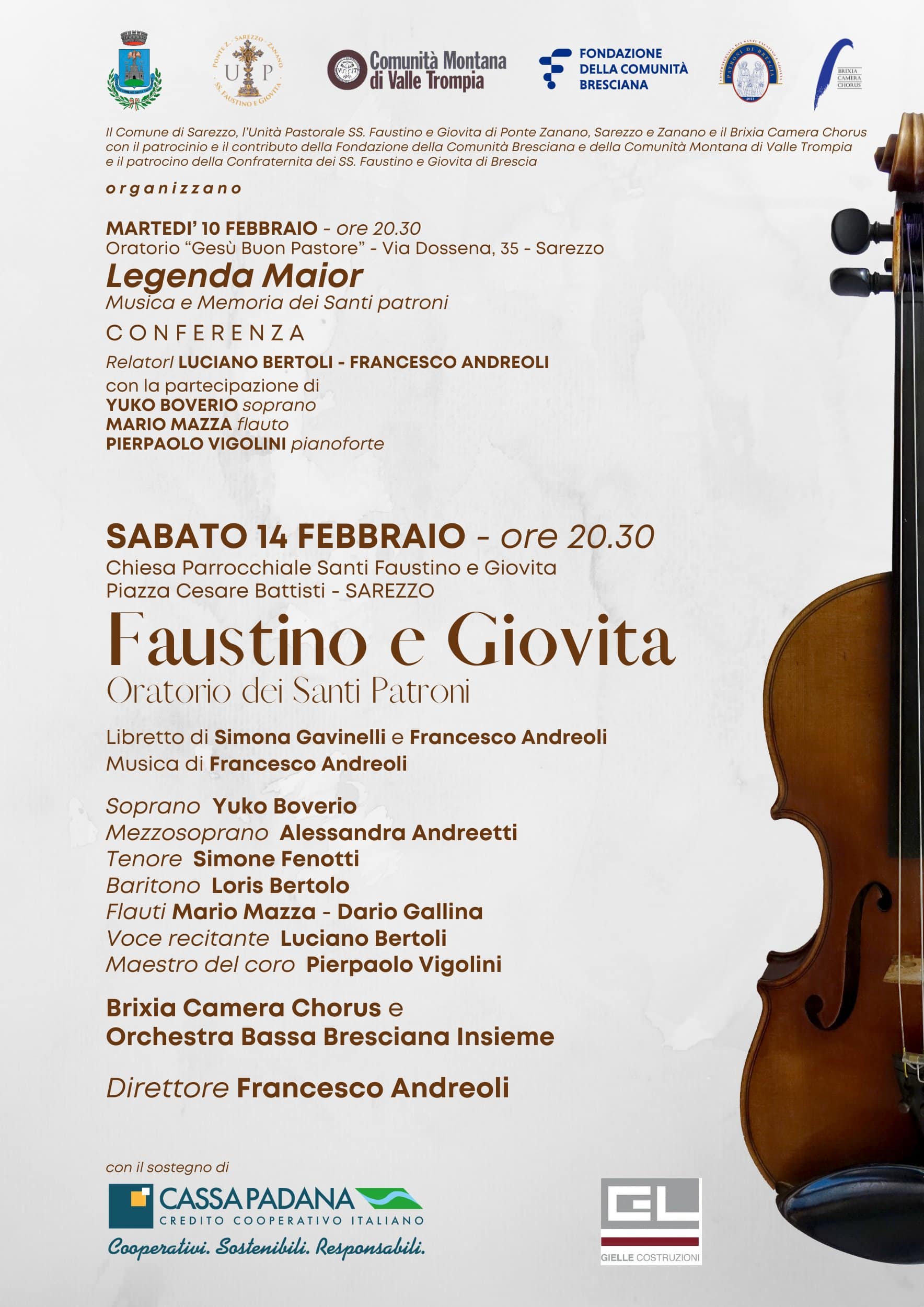 Il mese di febbraio a Sarezzo si tinge di cultura, spiritualità e grande musica. In occasione delle celebrazioni per i Santi Patroni Faustino e Giovita, la comunità è invitata a due appuntamenti imperdibili che uniscono l’approfondimento storico alla solennità del linguaggio orchestrale.