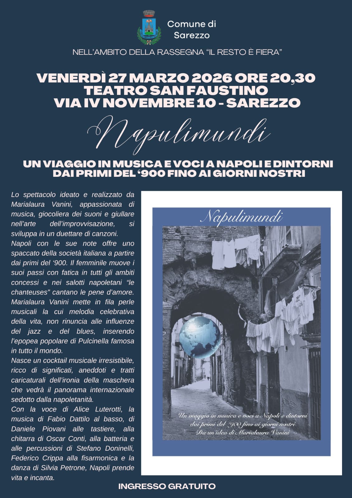 Con la voce di Alice Luterotti, la musica di Fabio Dattilo al basso, di Daniele Piovani alle tastiere, alla chitarra di Oscar Conti, alla batteria e alle percussioni di Stefano Doninelli, Federico Crippa alla fisarmonica e la danza di Silvia Petrone, Napoli prende vita e incanta.